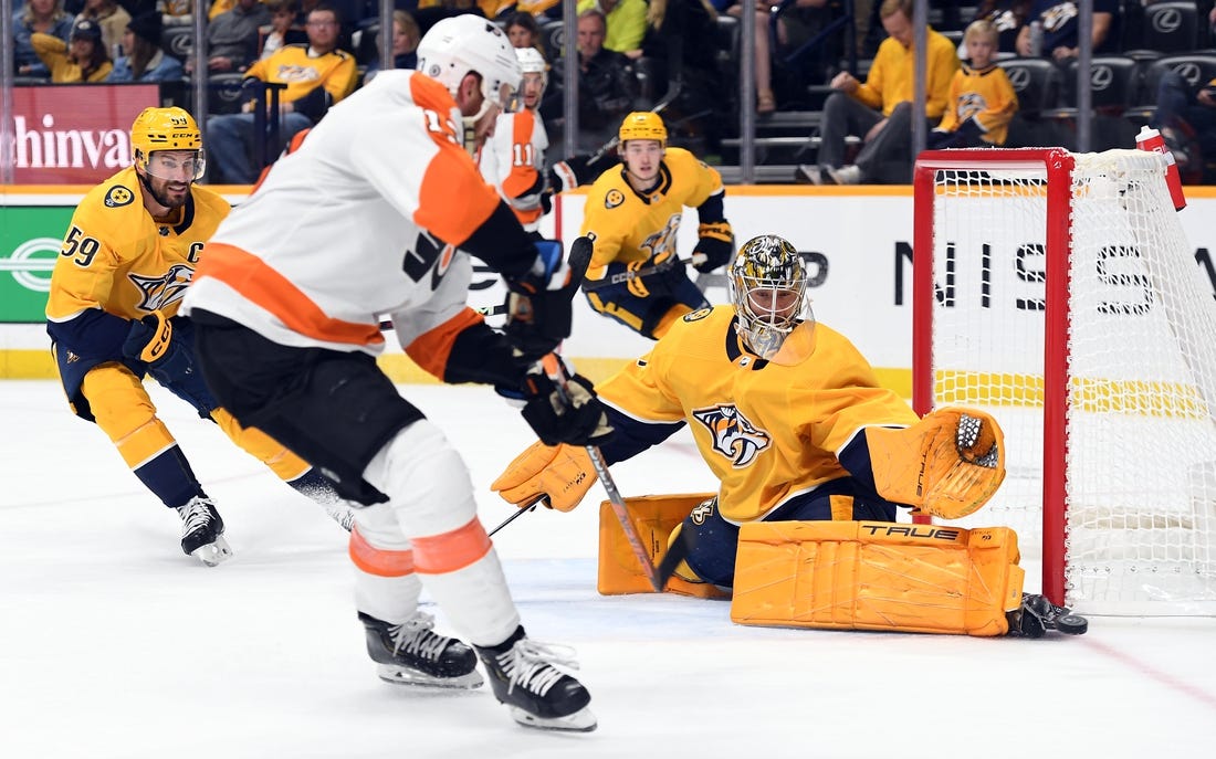 Carter Hart stopped 31 shots while Joel Farabee and Kevin Hayes combined for two goals and three assists against the Predators. Hayes has a goal with seven assists this season.