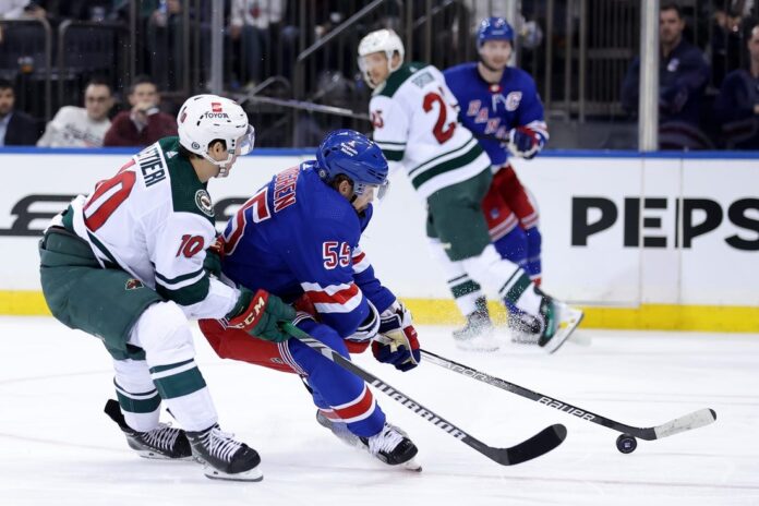 Lafreniere snapped the tie when the Rangers capitalized on a Minnesota miscue. Minnesota’s Marco Rossi made a pass from behind the New York net that Artemi Panarin intercepted.