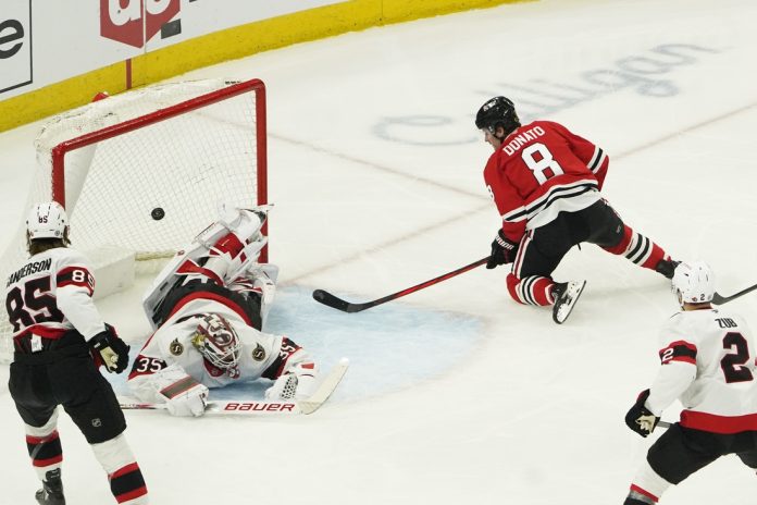Donato evened it for Chicago at 11:38 of the first. Landon Slaggert beat Sanderson to a loose puck and put a backhand feed on the tape for Donato, who slid a backhand past Ullmark’s outstretched left pad.