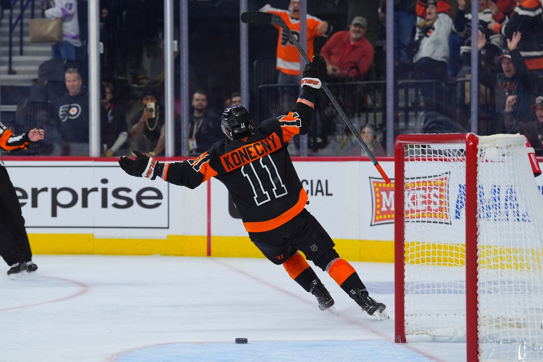 Konecny’s empty-netter marked his fourth multi-goal game of the season and his third in November alone.