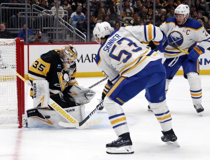 On a power play that carried over from late in the second, the Penguins made it 3-0. Karlsson ripped a shot from the center point that seemed to be earmarked for a tip-in try by Sidney Crosby, but instead the puck glanced off the stick of a Sabres player and over Luukkonen’s blocker 27 seconds into the third.