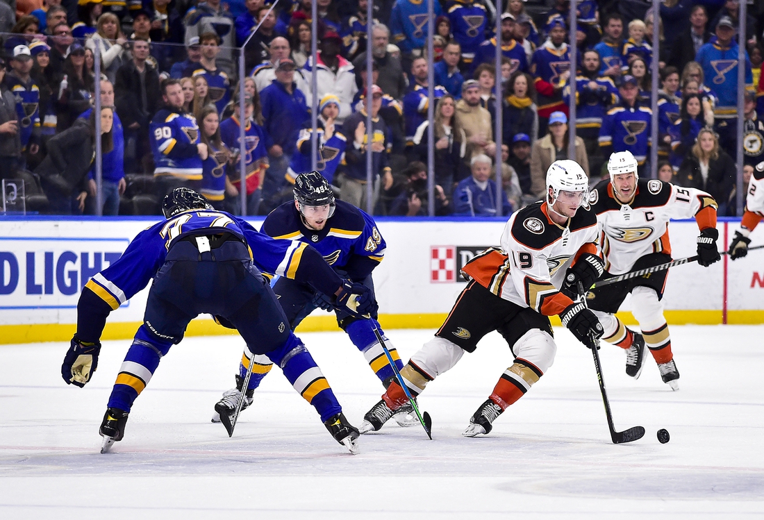 The Ducks outshot the Blues 11-7 in the tightly-played first period and took a 1-0 lead.