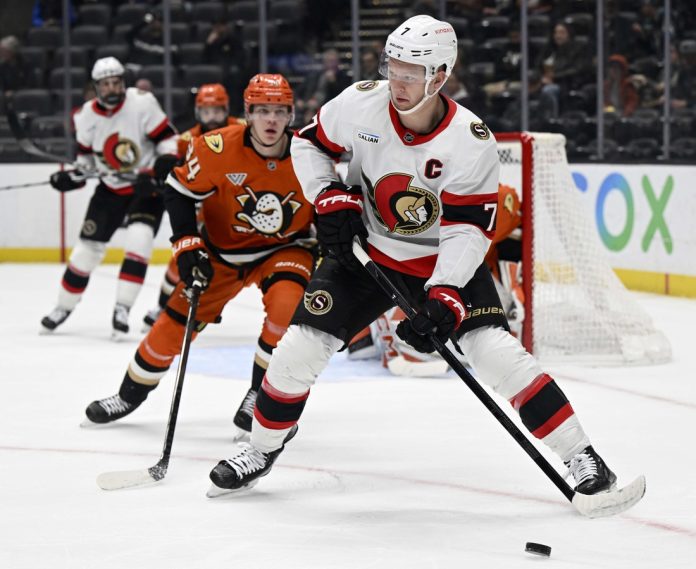 Three times the Ducks grabbed a lead and each time the Senators pulled even. Vatrano’s power-play goal at 14:45 of the first period opened the scoring, as the forward converted a one-timer from the slot, but Tkachuk tied the game just under three minutes later with a power-play goal of his own, a deflection of Tim Stutzle’s point shot.