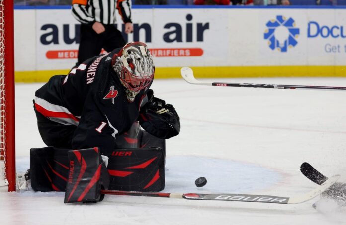 Peterka doubled the lead at 2:57 of the third period. From the corner of the rink, Peterka ripped a shot from below the goal line and banked his offering off Arvid Soderblom’s mask and into the net for his 14th of the campaign.