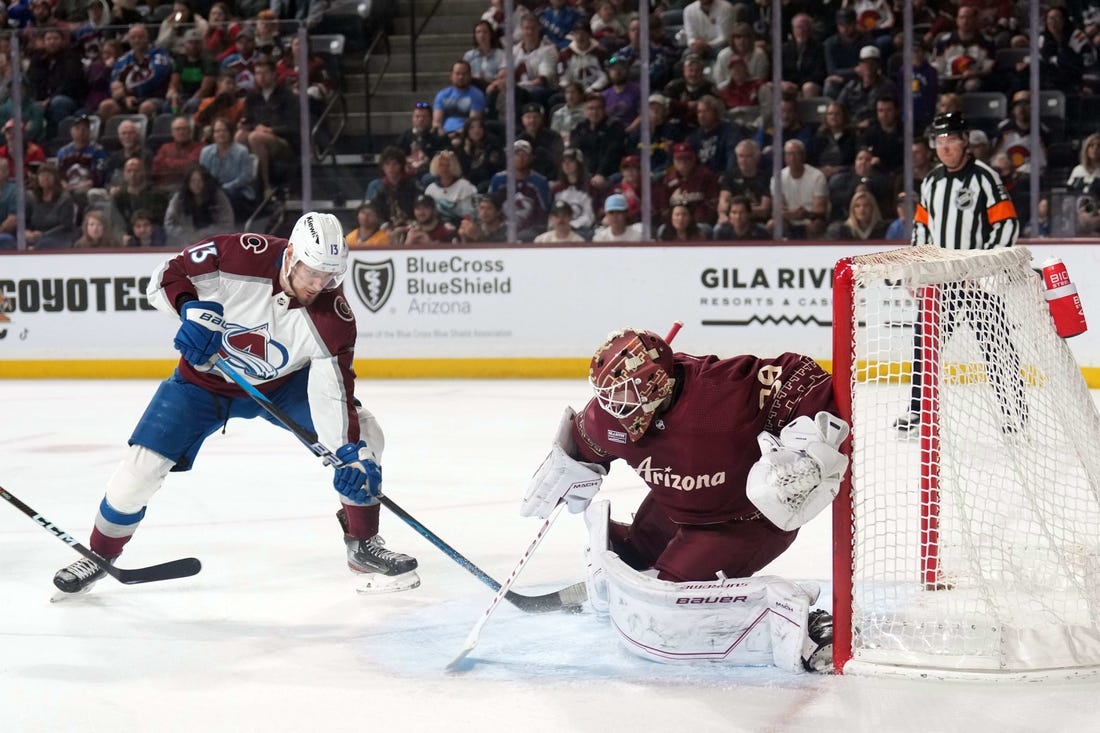 After a scoreless first period Colorado struck twice in the second. The Avalanche dumped the puck into the Arizona zone, Ingram controlled it behind the net and tried to send it around the boards and out. It hit Rantanen in the shoulder and came down behind the net, and he tucked it in on a wraparound at 9:30. It was his 48th of the season.