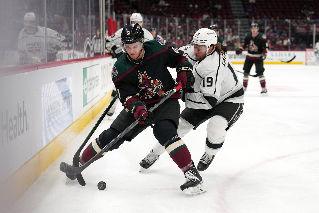Arvidsson moved the Kings ahead 2-1 at 7:35. Moore poked the puck off the stick of rookie defenseman Vladislav Kolyachonok in the Arizona zone. The puck slid to Phillip Danault, who made a quick centering pass to Arvidsson for the one-timer.