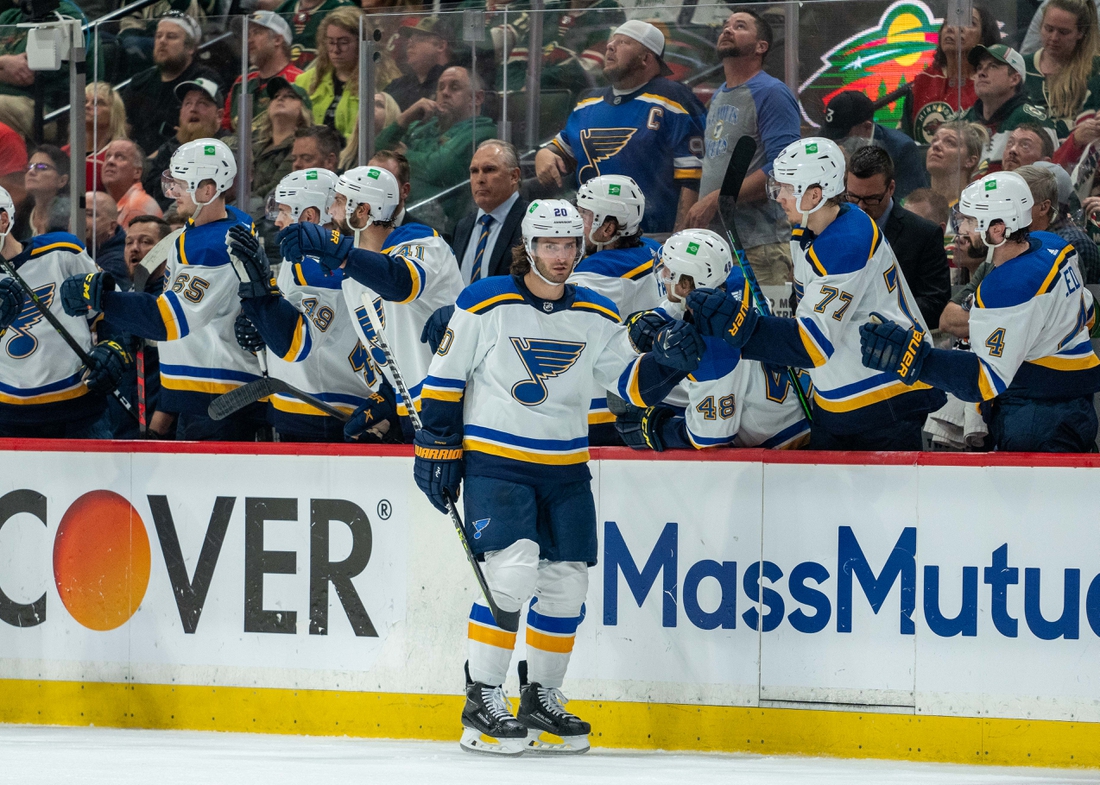 The Blues took a 3-2 lead at 1:03 of the third period. St. Louis dumped the puck in the Minnesota zone and Pavel Buchnevich got to it first behind the net before passing to Tarasenko in front for the one-timer.