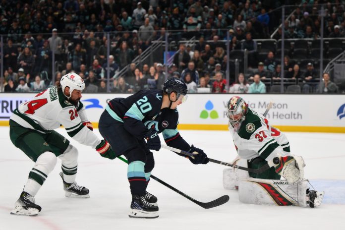 Trailing 3-1, the Kraken were awarded a penalty shot and a power play at 4:21 of the second period as Minnesota’s Brock Faber was called for slashing Eeli Tolvanen from behind on a breakaway, then sent Tolvanen headfirst into the end boards.