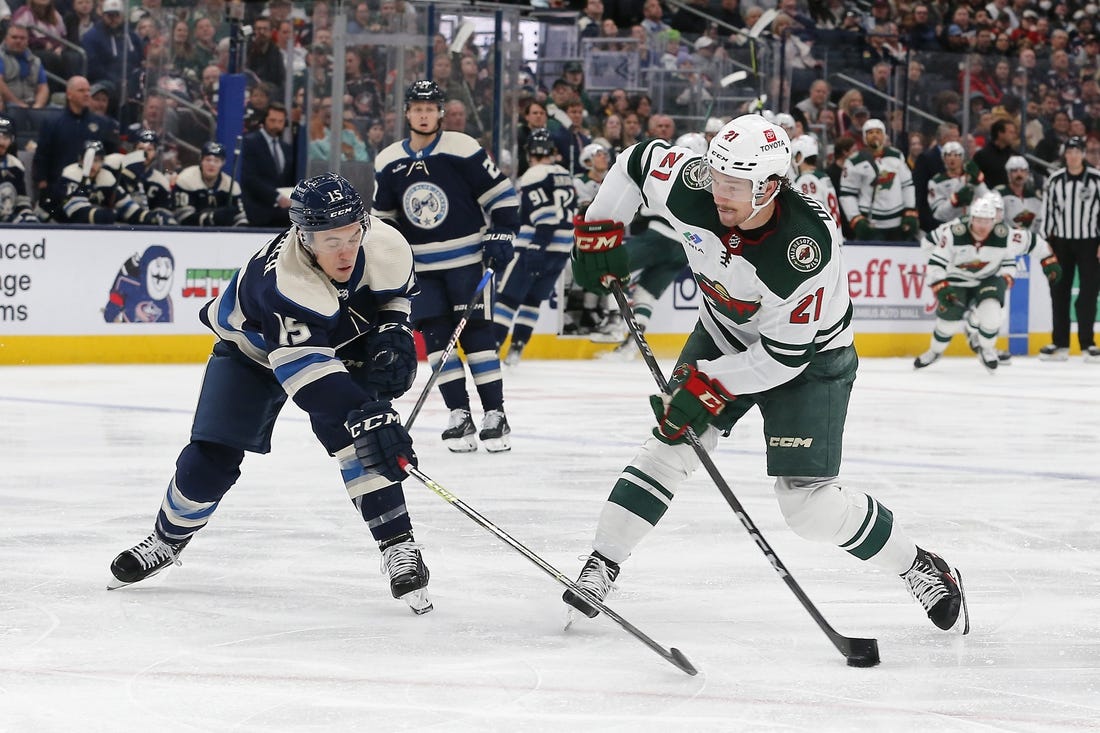 Minnesota forward Marcus Foligno played his first game since he blocked a shot with his left knee on Feb. 13 against the Florida Panthers.