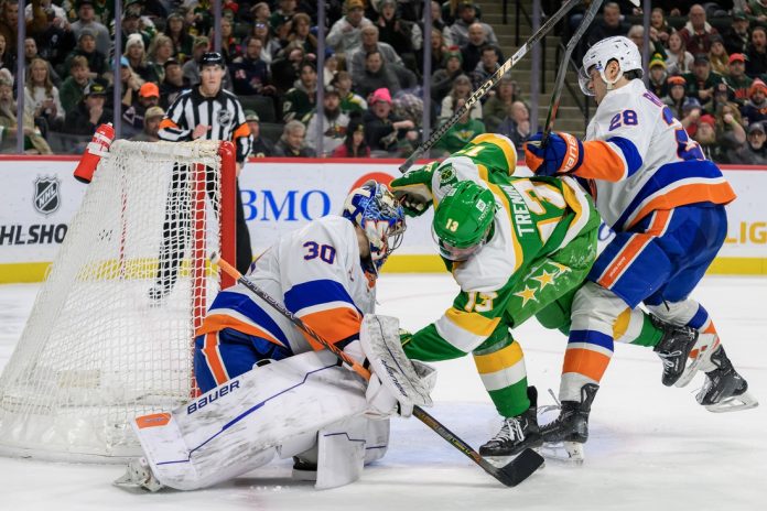 Gaudreau’s power-play goal 13:21 into the second pulled the Wild to within one. His shot from the left point went in off Islanders’ defenseman Tony DeAngelo. Boldy tied it with 2:01 left in the middle period when he tipped in a shot by defenseman Jonas Brodin. Trenin tipped in a shot by defenseman Jake Middleton with 1:10 remaining in the second period.