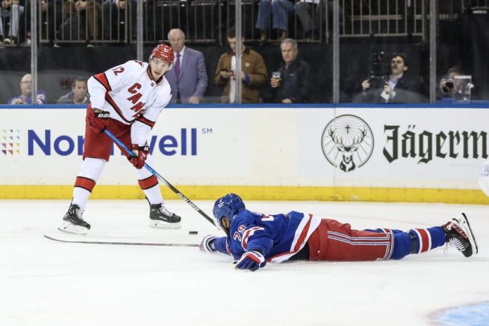 After New York spent most of the game struggling to generate offense against Carolina’s neutral zone trap and physical defense, the Rangers came alive midway through the third.