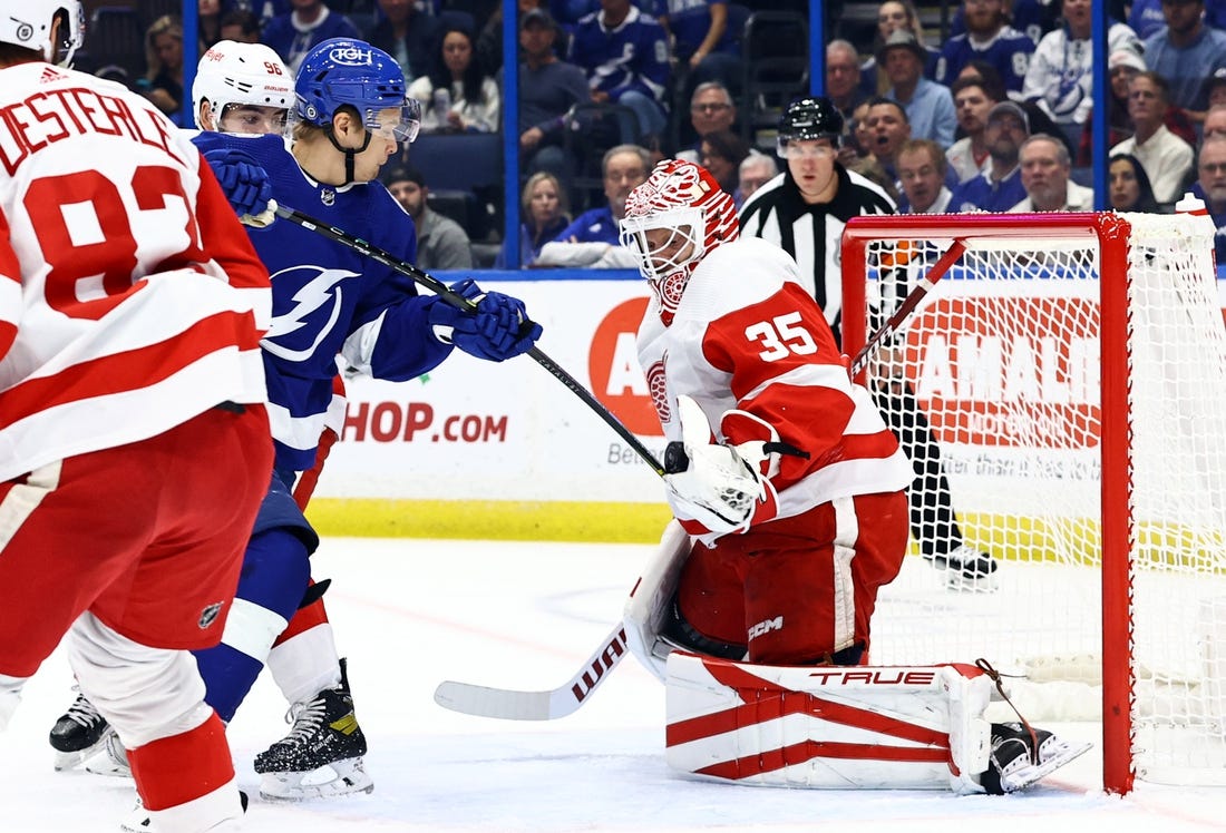 On one of the Lightning’s best scoring chances, Nicholas Paul stripped Lucas Raymond of the puck in the Detroit end, skated in on Husso and rang a hard shot off the left post in the closing minute of the middle period. However, the puck bounced out harmlessly, and the Red Wings headed to the dressing room holding the 1-0 edge.