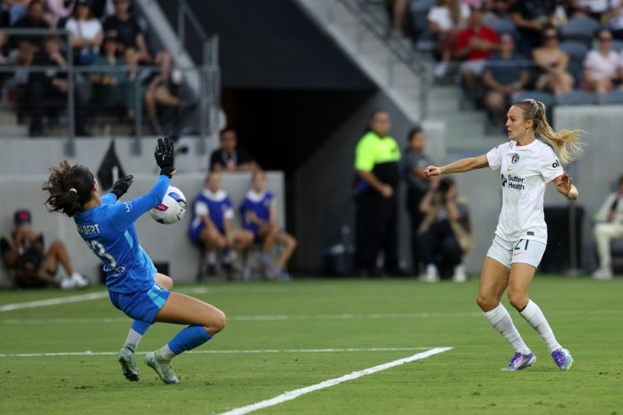 Angel City took a 1-0 lead in the 12th minute when Tiernan worked her way in from the left sideline, cut into the penalty area, stopped abruptly near the penalty spot, switched to her left foot and scored past Silkowitz. It was her eighth tally of the season.