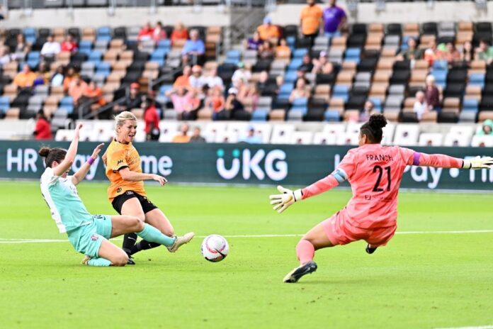 After Banda put a shot past her, Racing Louisville goalkeeper Katie Lund buckled down, keeping the visitors close by stopping another Banda attempt in the second minute of first-half stoppage time.