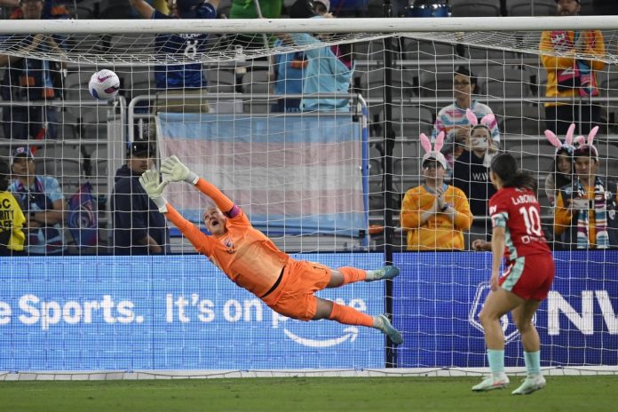 Also in the first half, a hand ball was called against San Diego’s Kristen McNabb. After a review confirmed it, LaBonta stood at the spot in the 25th minute and sent a right-footed, penalty-kick boot into the top left corner.
