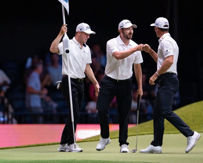 New York led 5-4 with two holes to play before Atlanta’s Billy Horschel hit his tee shot within 5 feet of the cup on No. 14. New York’s Rickie Fowler was within 9 feet after his tee shot. Atlanta “threw the hammer,” looking to double the value of the hole, but New York declined to concede one point, leveling the match.