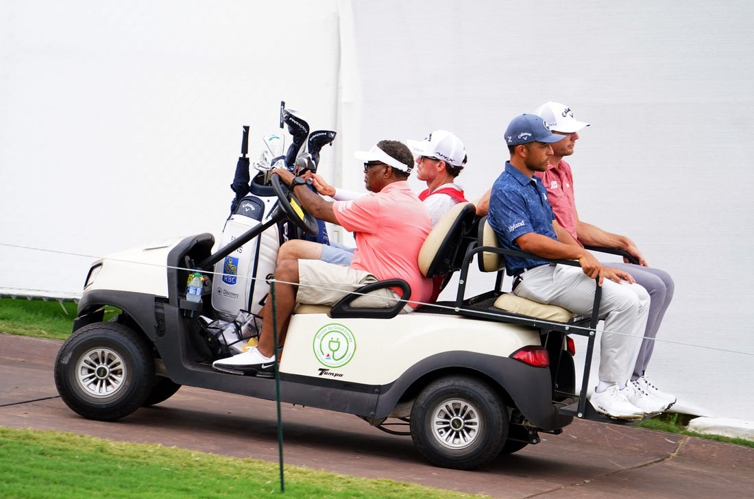 The final pairing of Viktor Hovland and Xander Schauffele had just begun playing the second hole at East Lake Golf Club when the horn sounded. A pouring rainstorm started soon after, and lightning storms in the Atlanta area were also a problem. It was uncertain how long the delay could last.