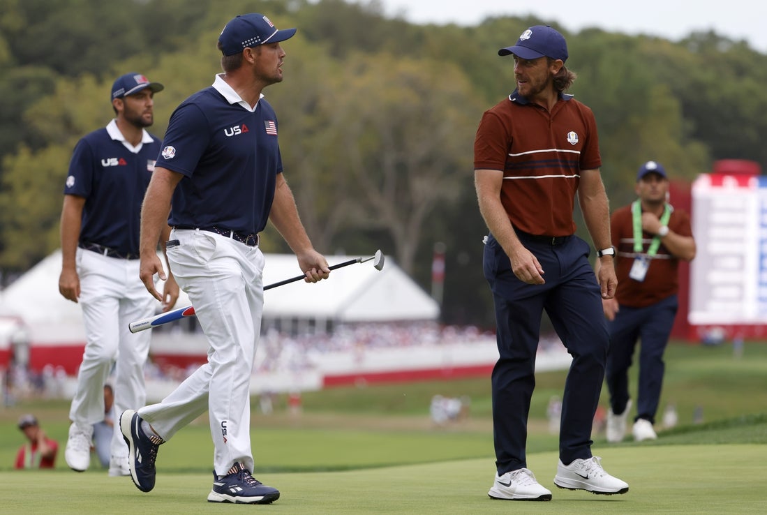 The last match also arrived at No. 18 all square, and Englishmen Matt Fitzpatrick and Tyrrell Hatton hit identical approaches within 3 feet of the cup, Hatton’s ball kissing Fitzpatrick’s. Patrick Cantlay and Sam Burns couldn’t make birdie, handing Europe a 1-up victory.