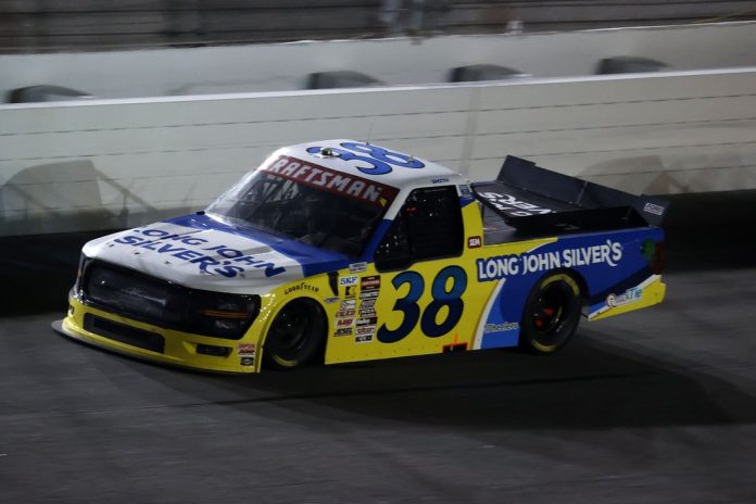The driver of the No. 38 Front Row Motorsports Ford then had to hold off NASCAR Cup Series moonlighter Kyle Larson over a seven-lap dash to the finish to claim his first NASCAR Craftsman Truck Series victory of the season, his second at the 0.533-mile short track and the sixth of his career.