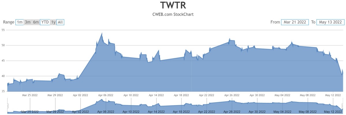 In morning trading, Twitter shares sank 8.7% to $41.15, well below the $54.20 per share, or $44 billion, that Musk agreed to pay for the firm last month. After Musk’s first tweet, the stock was down more than 20% in premarket trade.
