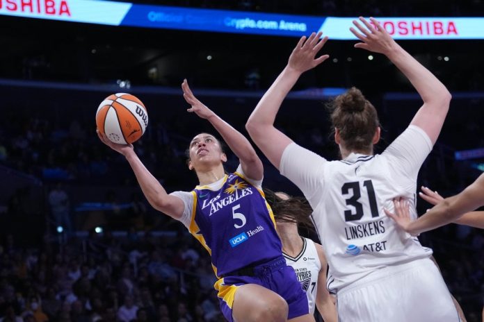 The heart of the run bridged the first two periods, with Golden State using an 8-1 spurt to get within 26-24 by first quarter’s end. The Sparks were then held scoreless for almost the first 7 1/2 minutes of the second quarter as the Valkyries took a 42-26 lead. Salaun buried a pair of 3-pointers in the 18-0, period-opening flurry.