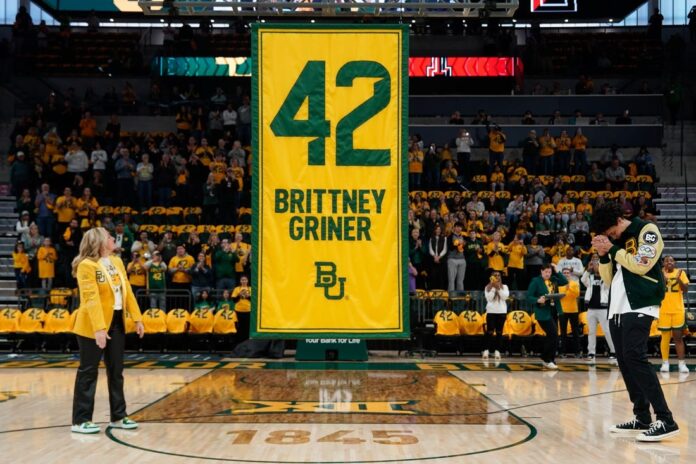 Former Baylor star Brittney Griner had her No. 42 jersey retired prior to a Bears women’s basketball game against Texas Tech Sunday in Waco, Texas.