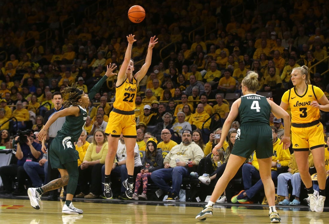 The Hawkeyes (14-1, 3-0 Big Ten) led by nine points midway through the fourth quarter, but the Spartans (11-3, 1-2) pulled level when Julia Ayrault made a layup with 1:27 to go.