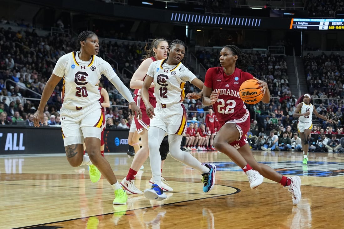 Indiana (26-6) mustered just 37.5 percent from the field against the tough South Carolina defense in the first half. But things turned around in the second, when the Hoosiers shot 55.2 percent and 43.8 percent from 3-point range (7 of 16) to turn the 17-point halftime deficit into just a two-point margin on Mackenzie Holmes’ layup with 1:08 to play.
