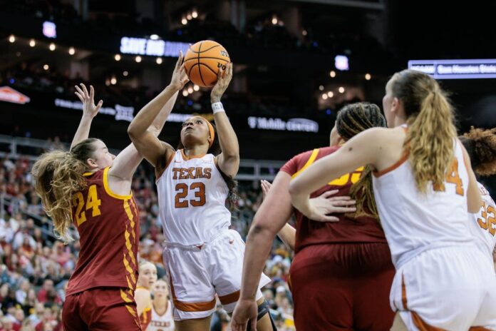 Beginning with Taylor Jones’ putback at the 2:05 mark of the first, Texas took command with a 16-0 run that included 11 straight points to open the second. Booker drilled a 3-pointer to close the first-period scoring, then capped the lengthy burst by scoring off her steal with 5:46 left in the first half.