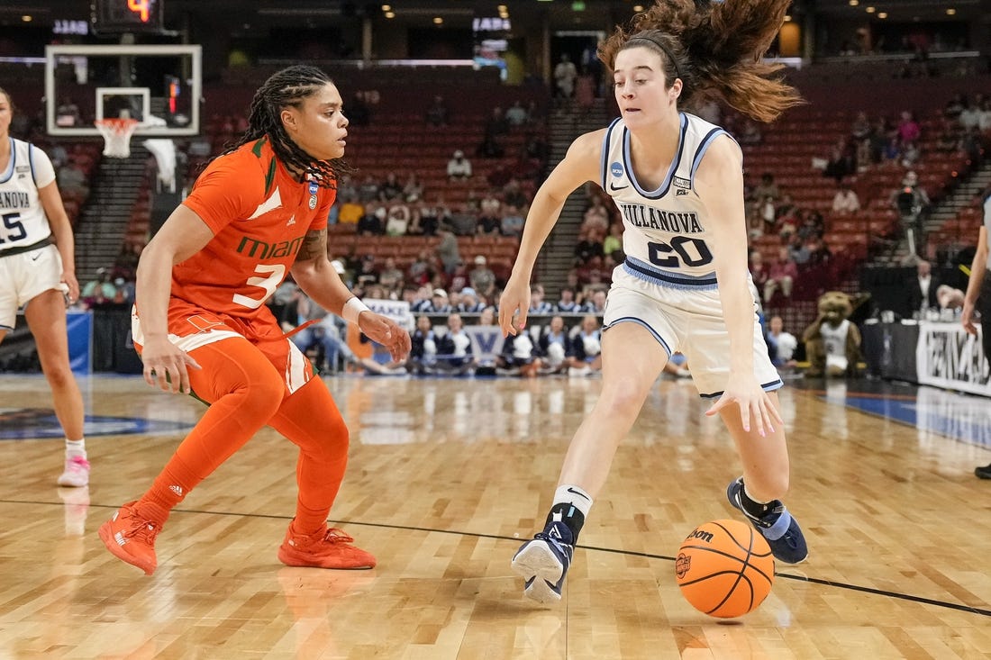 Jasmyne Roberts converted a three-point play with 38 seconds remaining to put Miami ahead and the ninth-seeded Hurricanes pulled out a 70-65 victory against fourth-seeded Villanova on Friday afternoon in the Greenville Region 2 semifinals in Greenville, S.C.