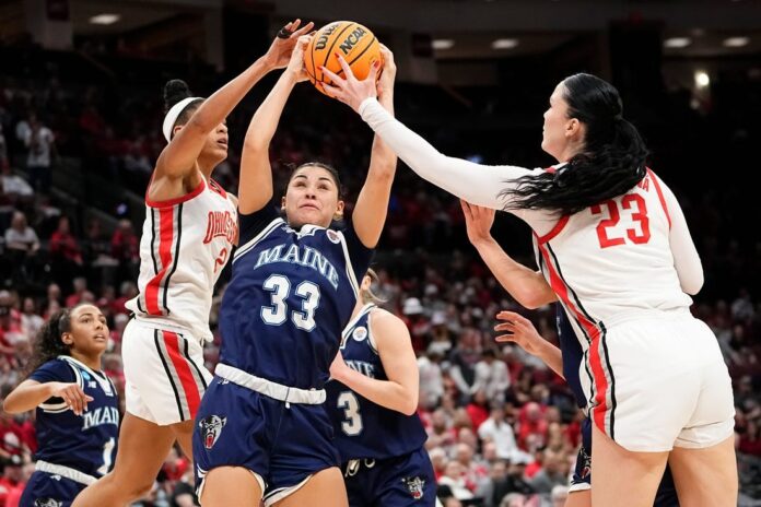 Jacy Sheldon scored 19 points as No. 2 Ohio State raced away from No. 15 Maine 80-57 in the first round of the Women’s NCAA Tournament on Friday in Columbus, Ohio.