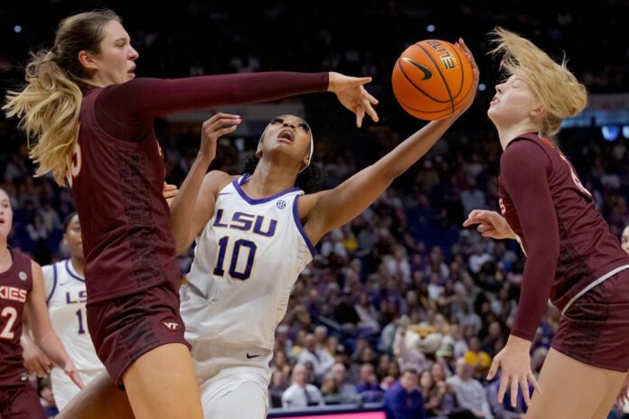 In a rematch of a game in last season’s Final Four, LSU got past Virginia Tech again on Thursday in an ACC/SEC Challenge game at Baton Rouge, La., as Tigers star Angel Reese returned to action.