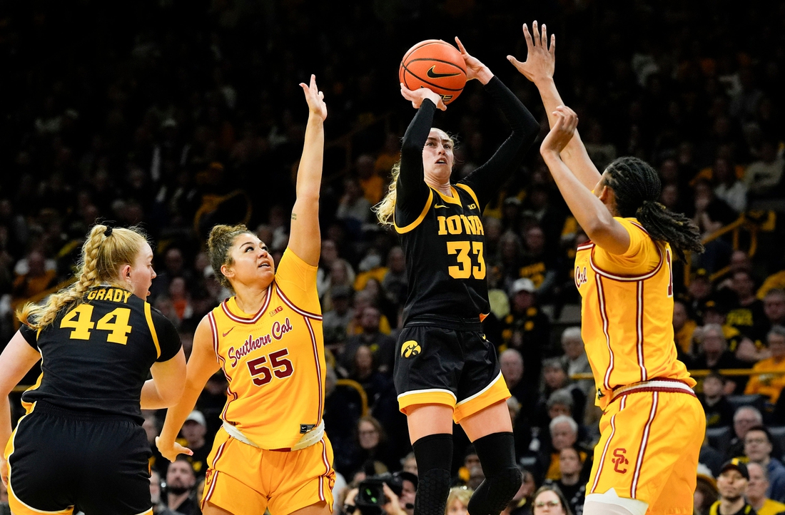 Lucy Olsen scored 28 points and host Iowa had a strong fourth quarter to hand No. 4 Southern California its first loss in Big Ten Conference play, 76-69 on Sunday in Iowa City.