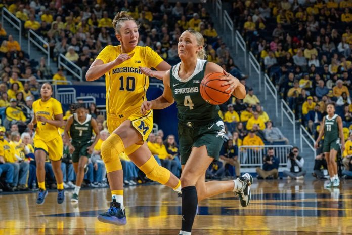 The Spartans got 18 game points apiece from Julia Ayrault and Grace VanSlooten, and Ayrault added 13 rebounds and three blocks. Michigan led by four at halftime, but Hallock and Ayrault scored the first 10 points of Michigan State’s 15-0 run to open the third quarter. Michigan briefly got to within 45-38, but the Spartans quickly pushed the lead back to double digits.