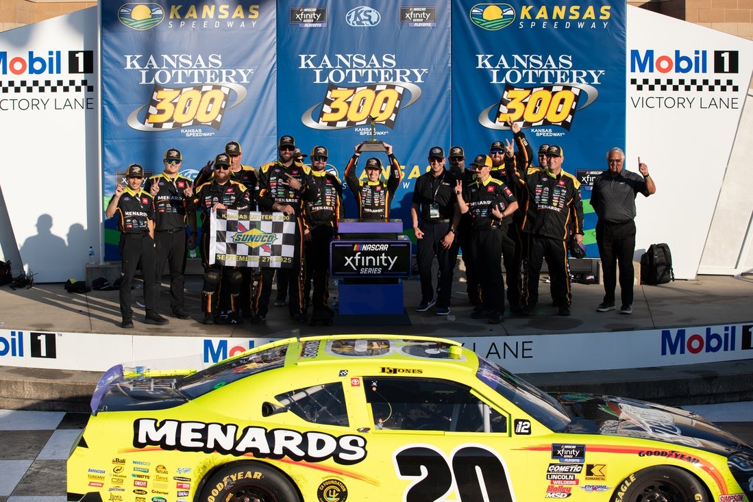 KANSAS CITY, Kan. — With a flawlessly executed race from start to finish, Brandon Jones preserved his bragging rights at Kansas Speedway, winning Saturday’s Kansas Lottery 300 NASCAR Xfinity Series playoff race.