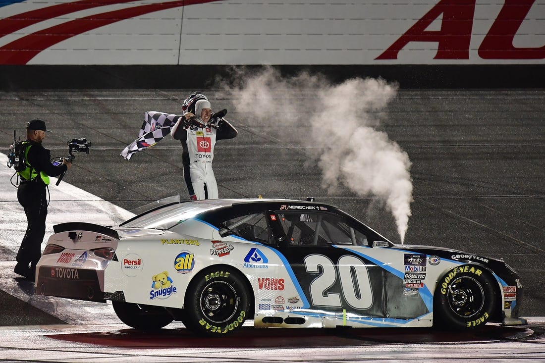 And after Kyle Busch won the Cup race, Nemechek, who drove for Busch in the NASCAR Craftsman Truck Series last year, took the checkered flag in his first full-time stint in the JGR Supra.