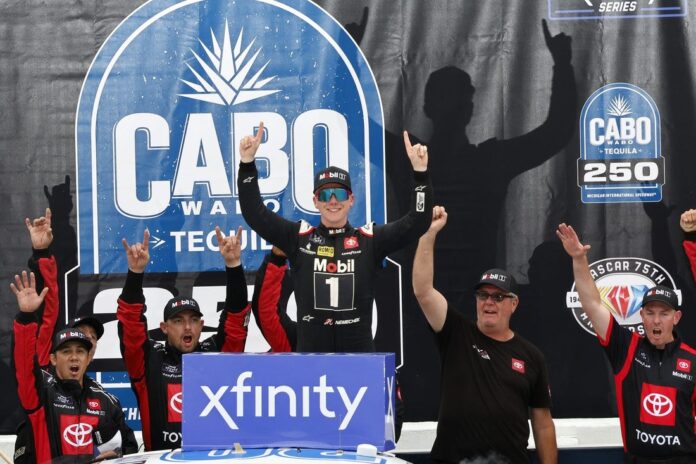 BROOKLYN, Mich. — Overcoming an early wreck, a late caution and an angry teammate, John Hunter Nemechek claimed a milestone victory in Saturday’s Cabo Wabo 250 at Michigan International Speedway.