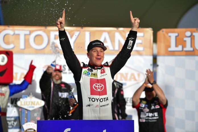 “Hats off to all the guys on this 20 team for Joe Gibbs Racing,” said Nemechek, who led a race-high 99 laps in securing his first victory of the season, his first at Las Vegas and the 10th of his career.