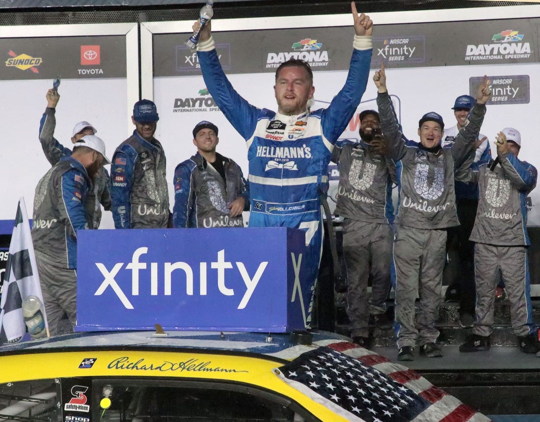 DAYTONA BEACH, Fla. — Justin Allgaier survived a trip to the rear of the field, a pass-through penalty after the initial start and a war of attrition to win Friday night’s Wawa 250 Powered by Coca-Cola NASCAR Xfinity Series race at Daytona International Speedway in overtime.